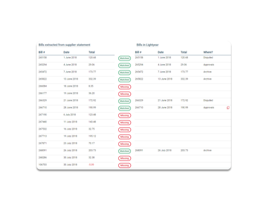 Reconcile supplier statements in seconds with an automated tool that matches your bills in Lightyear to your suppliers statement. Send emails directly to your suppliers requesting missing documents for faster payments, fostering better supplier relationships.